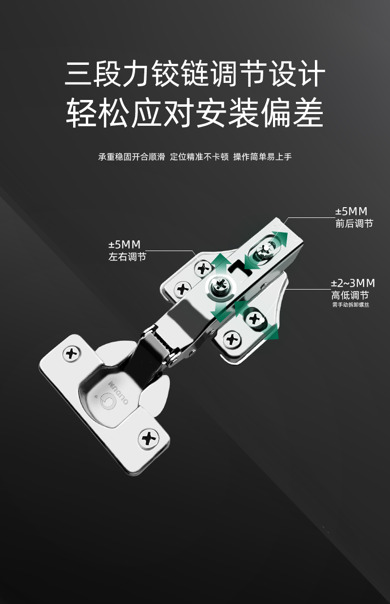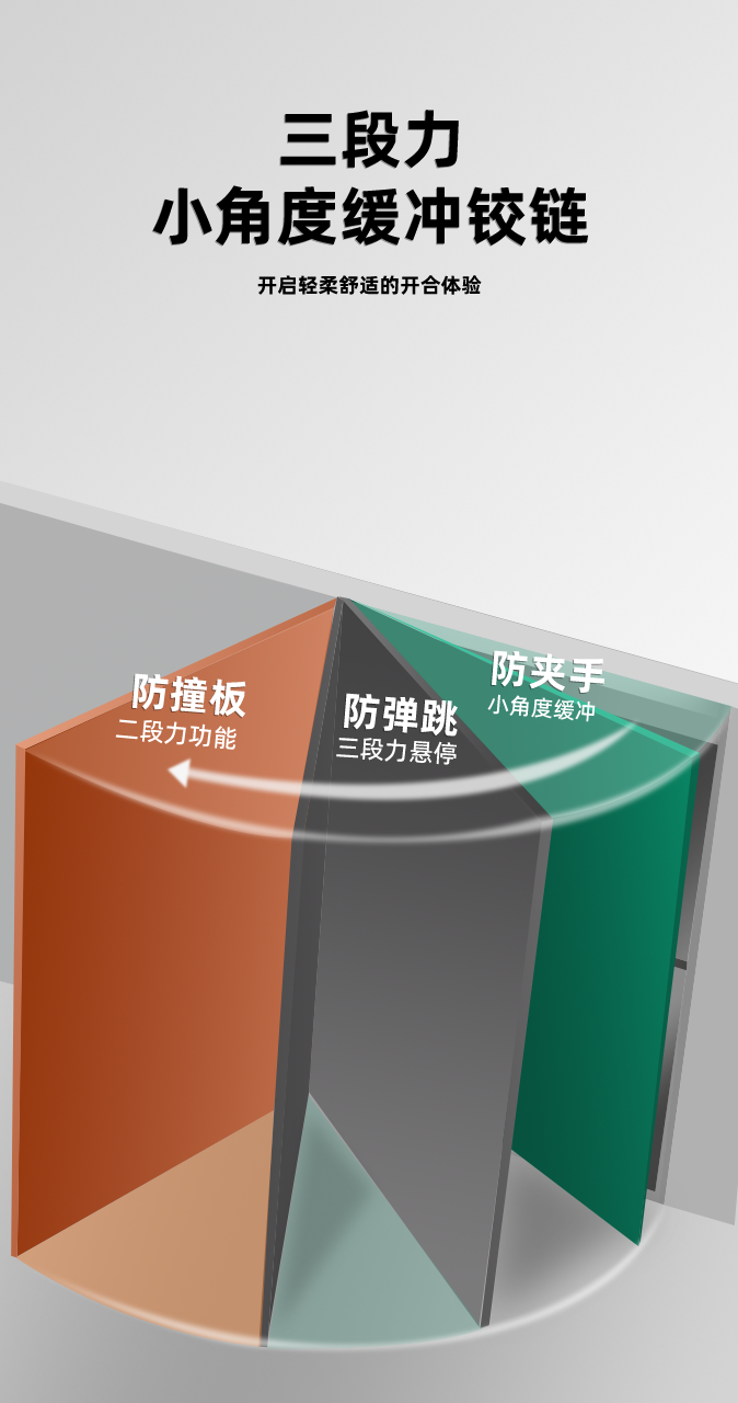 产品描述:专为橱柜、衣柜、卫浴柜等家具设计,以三段力值精准调控与液压阻尼技术,实现开得顺畅、停得稳固、关得静音,兼顾承重、安全与耐用,适配各类家装与定制家具场景。